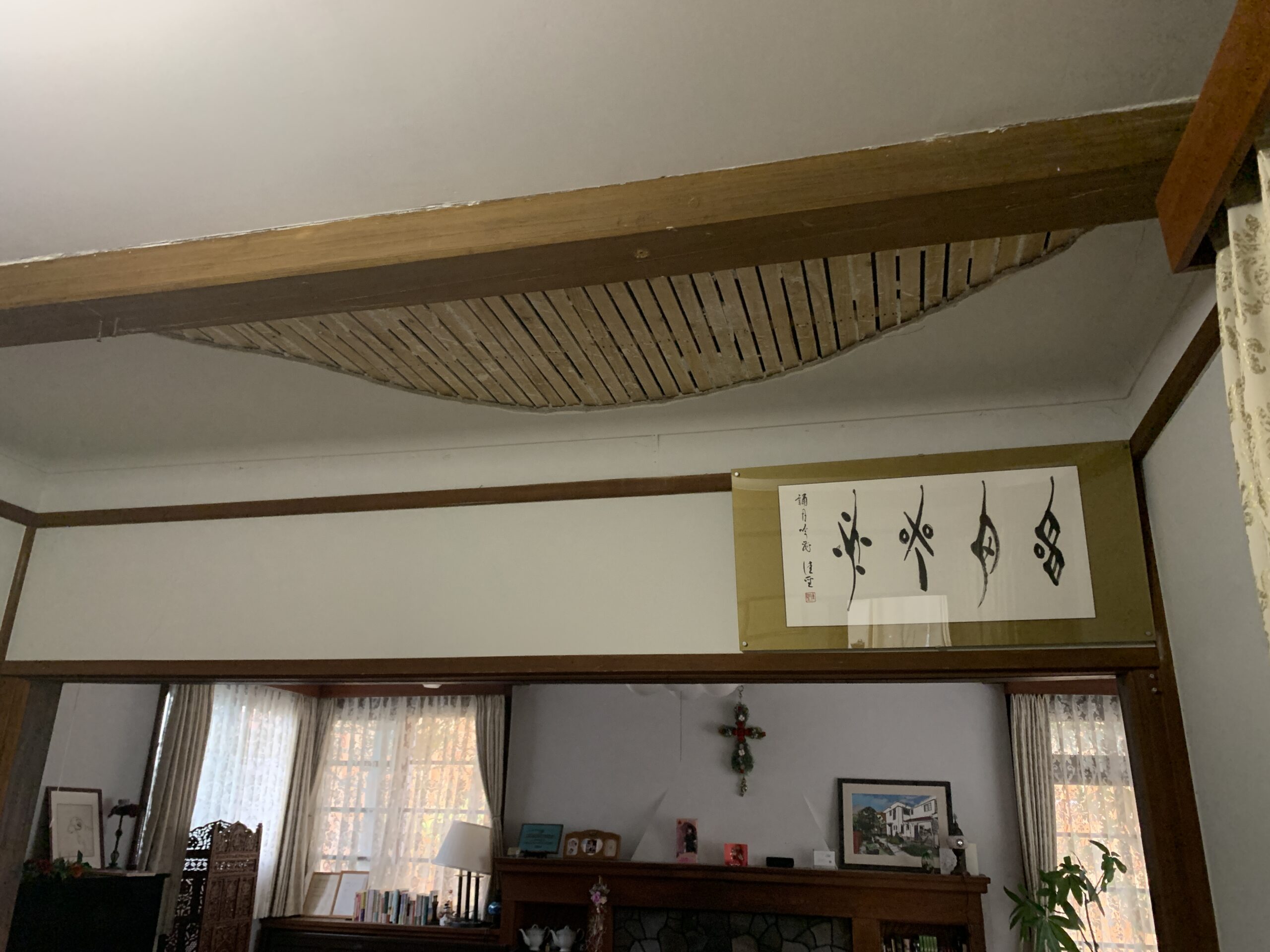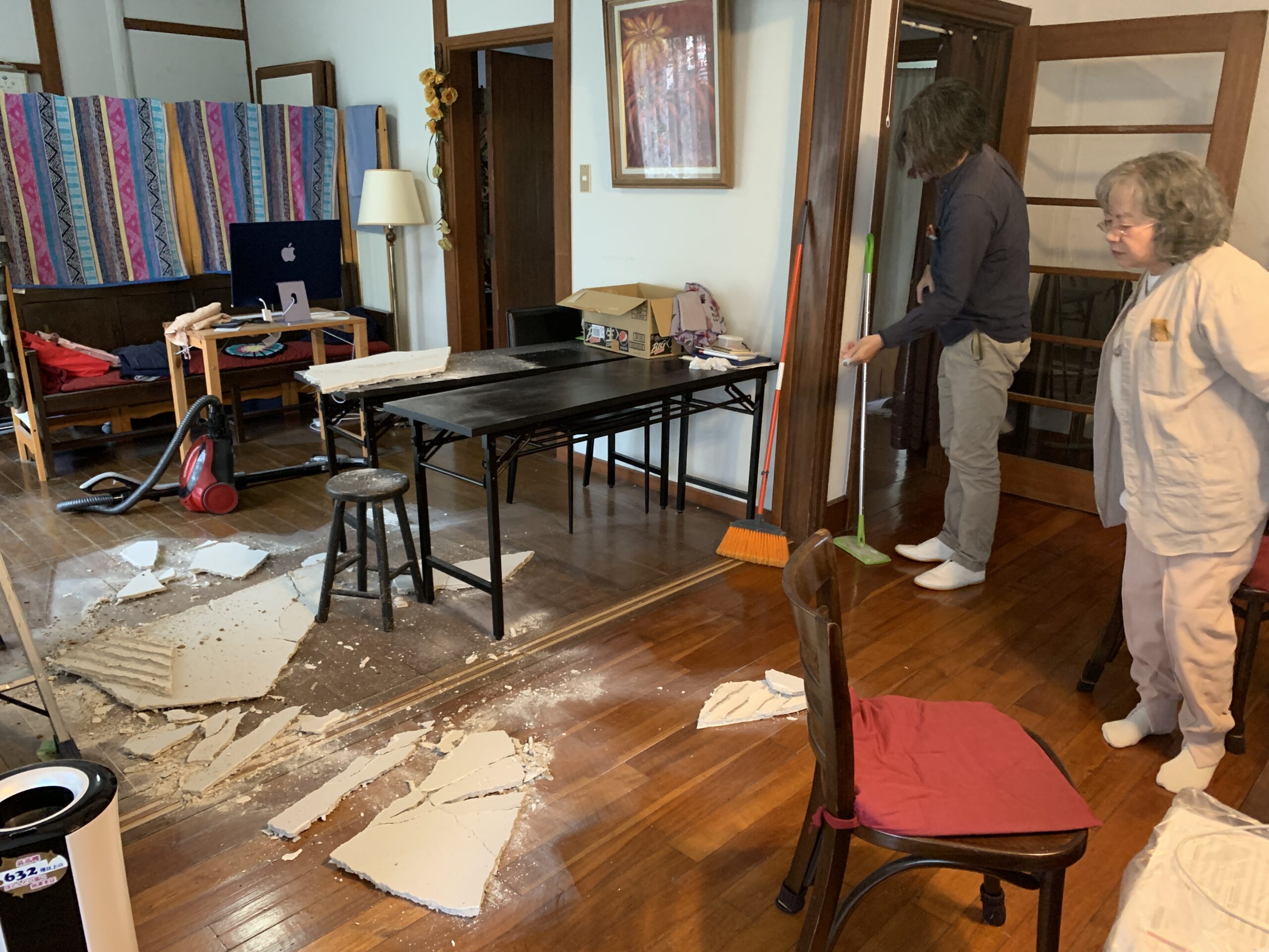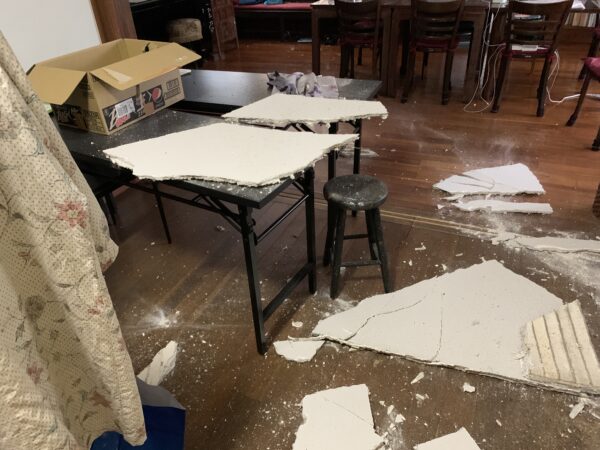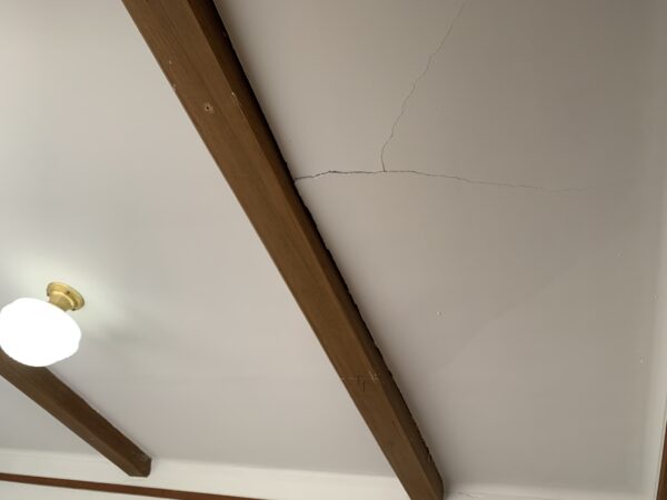 ニュース&トピックス ダイニングの天井が落ちた! なんとなく、最近、天井に異変が・・・。 この亀裂、日々大きくなっているみたいな気がする。 ダイニングの天井です ちょうど排水のチェックに来ていた建築士の中川さんにみてもらい この下を通らないでね!と言われて気をつけて過ごした 翌日の朝です うわっ!! 速攻で中川さんと、古谷部長にSOS 現地調査