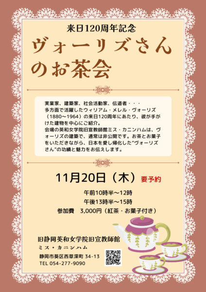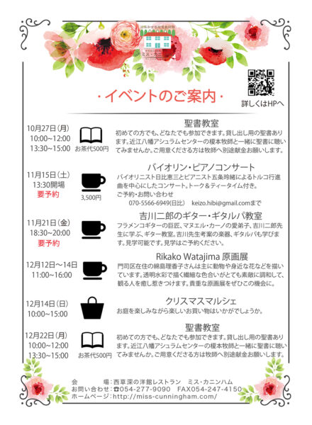 2025年10月〜12月イベントのお知らせ 2025.10.08 すっかり秋らしくなってまいりましたね。 宣教師館のお庭は虫たちの演奏会が繰り広げられています。 秋の風に吹かれながらお散歩。ぜひ、お立ち寄りください。 詳しくみる