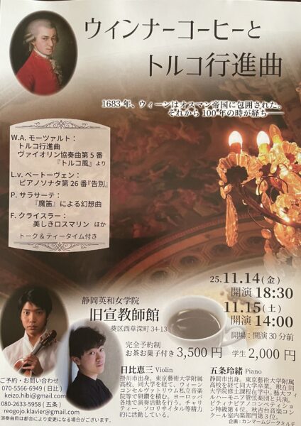 【11月14日(金)・15日(土)ヴァイオリン&ピアノコンサート 2025.10.11 静岡を拠点に活躍するヴァイオリニスト、日比恵三さんと静岡出身の五条玲緒さんのコンサートです。ウィーンに留学され、ヨーロッパ各地で活躍された日比さん。ウィーンの音楽をお楽しみください。 お申し込み・お問い合わせ o7o-5 […] 詳しくみる