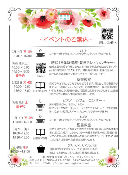 【中止のお知らせ】1月13日カフェコンサートは中止となりました 2024.12.28 いつもミスカニンハムをお支えくださりありがとうございます。 1月13日に予定しておりましたカフェコンサートですが、演奏者が体調不良となり暫く休養することとなりました。残念ですが1月13日のカフェコンサートは中止とさせてい […] 詳しくみる